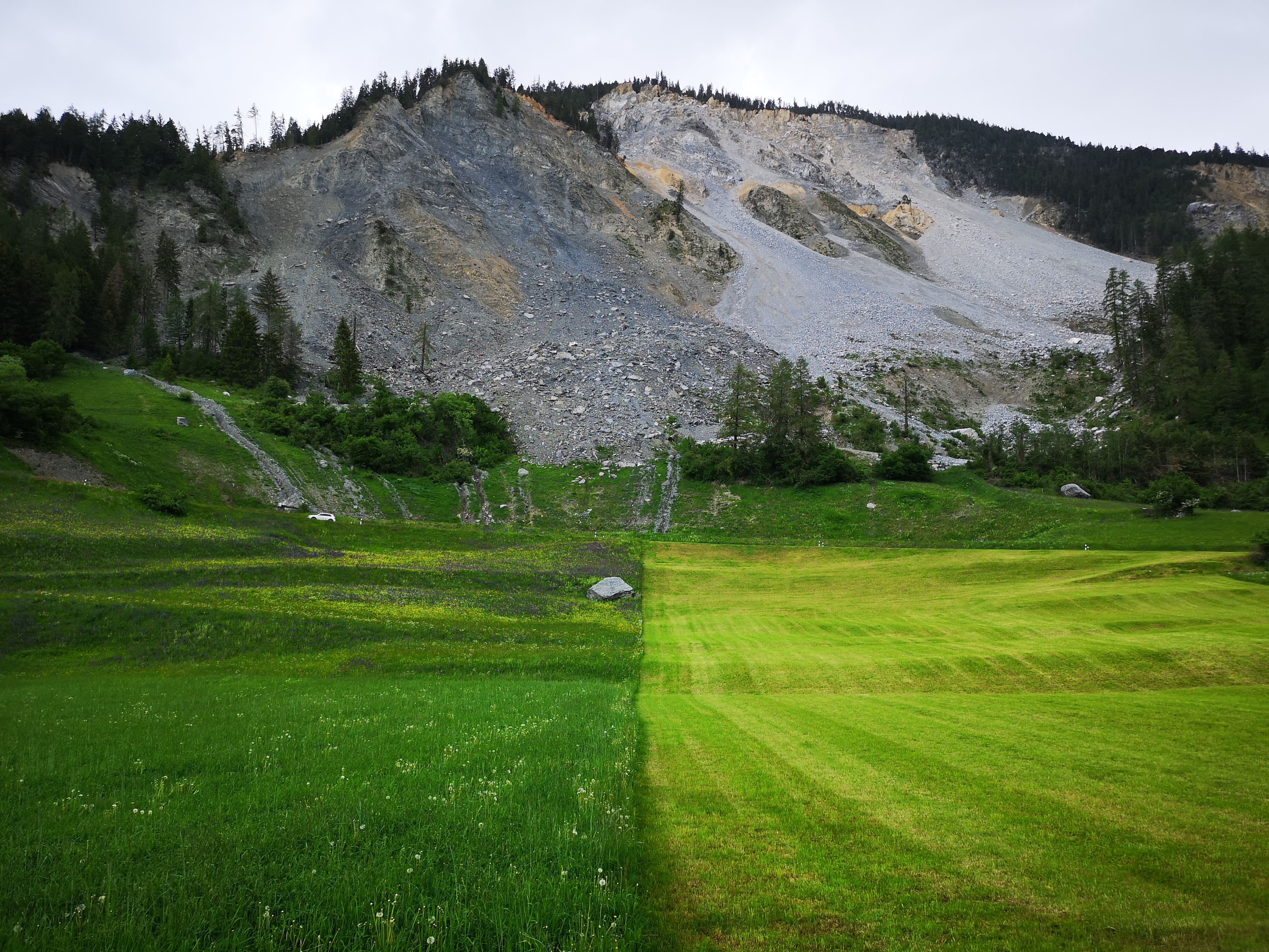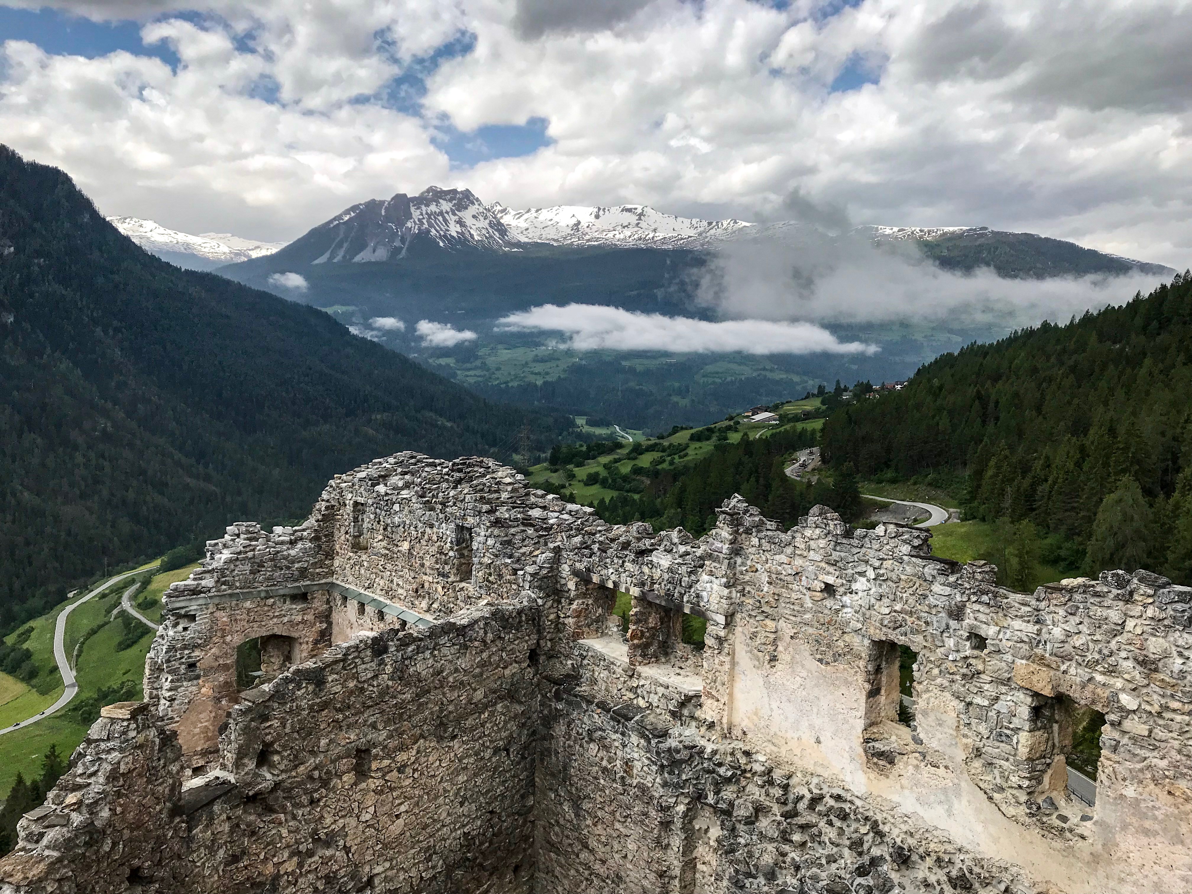 Ausgeschlafen und nach dem Frühstück laufen wir zur Burgruine Belfort mit Aussicht aufs Albulatal. Weiter führt der Weg durch den Wald, über Wiesen bis zum Dorf Brienz. Hier fällt uns der imposante Felssturz und ein etwas schräg stehender Kirchturm auf, über den wir zwei Tage später in der Zeitung lesen. Das Dorf Brienz/Brinzauls ist in Gefahr und der Felsen wird permanent überwacht. Grund dafür: Der Ort liegt auf einer 150 Meter dicken Felspartie welche jährlich einen Meter talwärts rutscht. Am Pfingstmontag war aber alles ruhig, nur die Regenwolken holen uns dann doch noch ein. Kurzerhand biegen wir ins Restaurant Rezgia Viglia ab und gönnen uns einen Apfelstrudel und Kaffee vor der Heimreise.