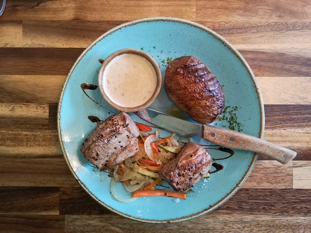 Verpflegung | Bis auf eine Unterkunft haben wir nur Zimmer mit Frühstück gebucht. Für uns einfach praktisch, sich am Morgen direkt in der Unterkunft für den spannenden Tag zu stärken. Man findet aber auch ein gutes Angebot an Verpflegung in den Tankstellen, Supermärkten und Bäckereien. Tagsüber haben wir uns meist mit Snacks versorgt, dafür aber abends jeweils bei einem leckeren Essen den Tag ausklingen und Revue passieren lassen. Lamm und Fisch stehen häufig auf der Karte, aber es gab auch genug Auswahl an anderen Köstlichkeiten. Die Preise sind vergleichbar mit denen in der Schweiz und dass immer ein Krug mit Wasser kostenfrei aufgetischt wird, fanden wir richtig klasse.