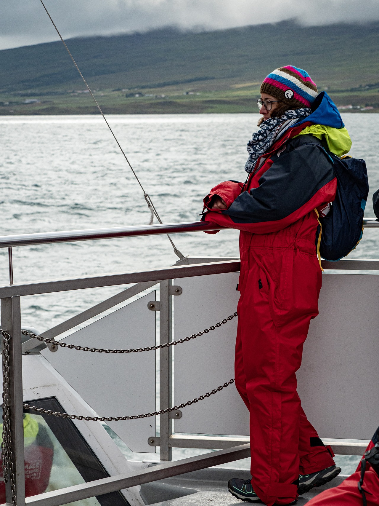 Ab aufs Boot für die Walsafari, Leinen los und für 3h hinein in den Thermoanzug. Die 1.5h auf dem Fjord bis zum Wendepunkt waren eisig und es gab ziemlichen Wellengang. Sofort nach der Kehre wurde es fast windstill und sogar wieder etwas wärmer. Leider haben wir auf der ganzen Tour keinen einzigen Fisch, geschweige denn einen Wal gesehen. Nur ein paar Möwen sind ums Boot gekreist. In diesem Fall kann man sich übrigens zwei personalisierte Gutscheine für eine kostenlose Fahrt ausstellen lassen, die man innerhalb von 2 Jahren einlösen darf.