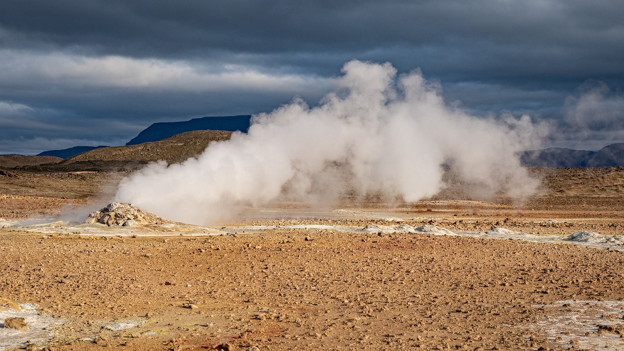 Nur 10 min Fahrt weiter solltest Du unbedingt am Hverarönd stoppen. Dies ist ein aktives Feld mit heissen Quellen unter dem Berg Namafjall. Der Berg sowie das Feld gehören ebenfalls zum aktiven Vulkanismus des Krafla-Vulkansystems. Nimm Dir Zeit und spaziere durch diese besondere Landschaft zu den Thermalquellen, kochenden Schlammtöpfen und dampfenden Quellen. Aber Achtung, Luft anhalten, denn aus den sogenannten Solfataren bei den Steinhaufen riecht es durch den Schwefelwasserstoff ziemlich nach faulen Eiern.