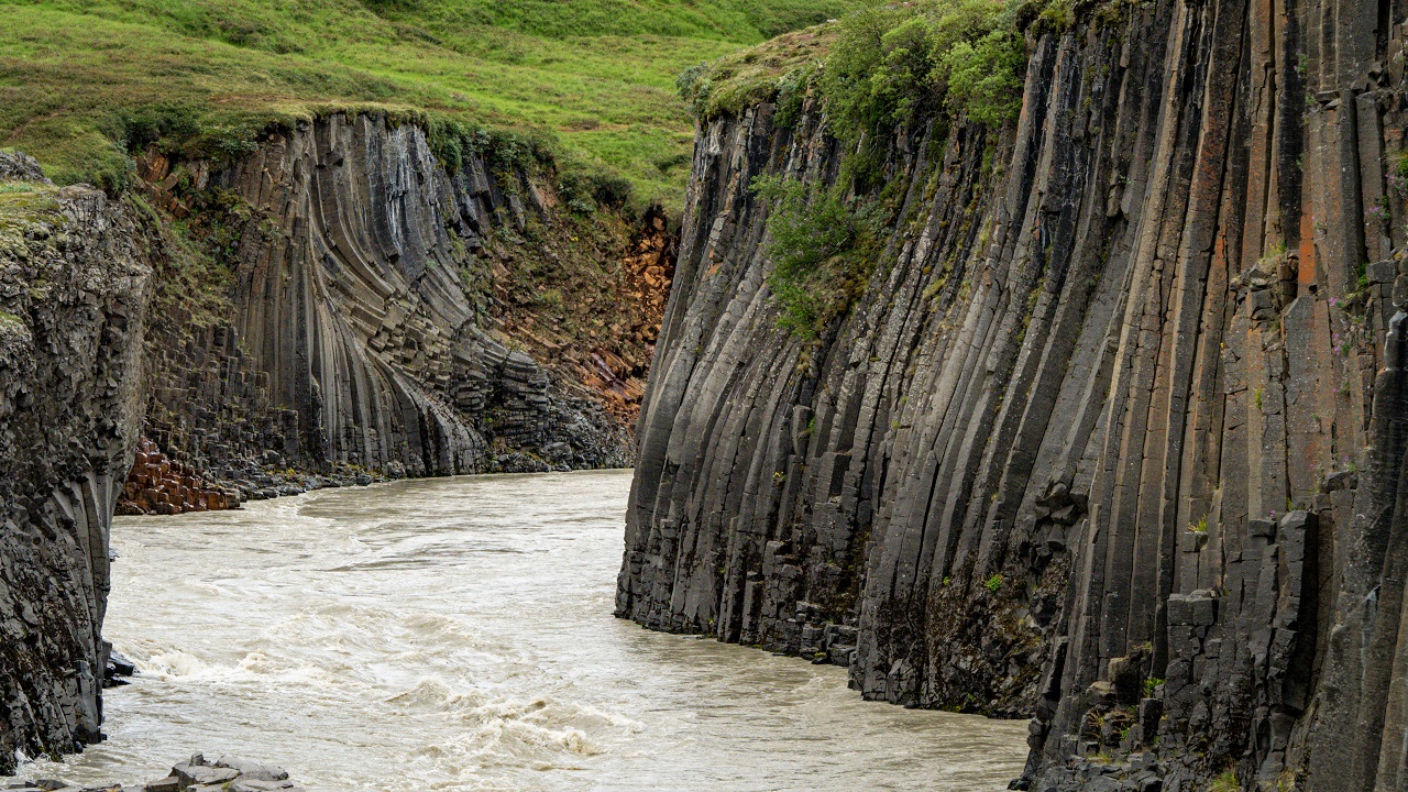 Ca 1h von Egilsstaðir befindet sich der Stuðlagil Canyon mit zwei Aussichtspunkten. Die Schlucht hat eine der größten und schönsten Basaltsäulenformationen Islands, die lange Zeit unter Wasser verborgen war. Erst mit dem Bau des Wasserkraftwerks Kárahnjúkavirkjun wurde der Wasserfluss im Gletscherfluss Jökulsá á Dal, auch Jökla genannt, stark reduziert und brachte die Schönheit des Gesteins zum Vorschein.