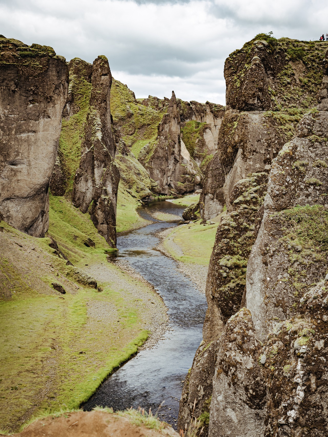 Nach einer Stärkung und mini Shopping in Vik, fahren wir ca. 50 min Richtung Osten und erreichen kurz vor Kirkjubaejarklaustur die Grüne Schlucht – Fjaðrárgljúfur Canyon und folgen dem Weg auf einen kleinen Spaziergang. Es wurden verschiedene Aussichtsplattformen angelegt, von denen Du in die Schlucht sehen kannst.