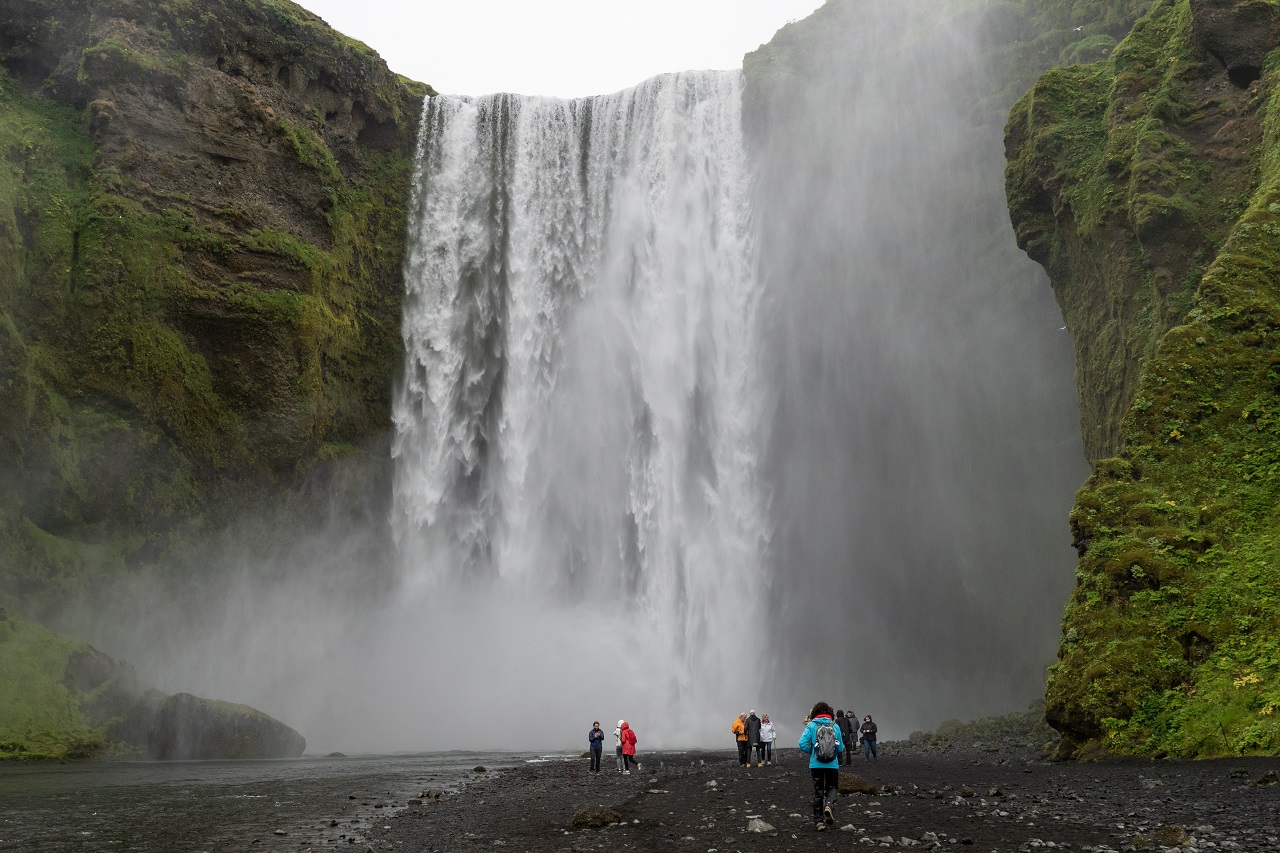 Etwa 25 min weiter auf der Ringstrasse folgt schon der nächste Wasserfall. Auf dem schwarzen Sand vorm 60 Meter hohen Skógafoss wird man in Gischt gehüllt, so nah kann man sich den Wassermassen nähern. Über ein paar Stufen erreichst Du die obere Kante und kannst einen Blick nach unten wagen und die Aussicht über die weite Landschaft geniessen.