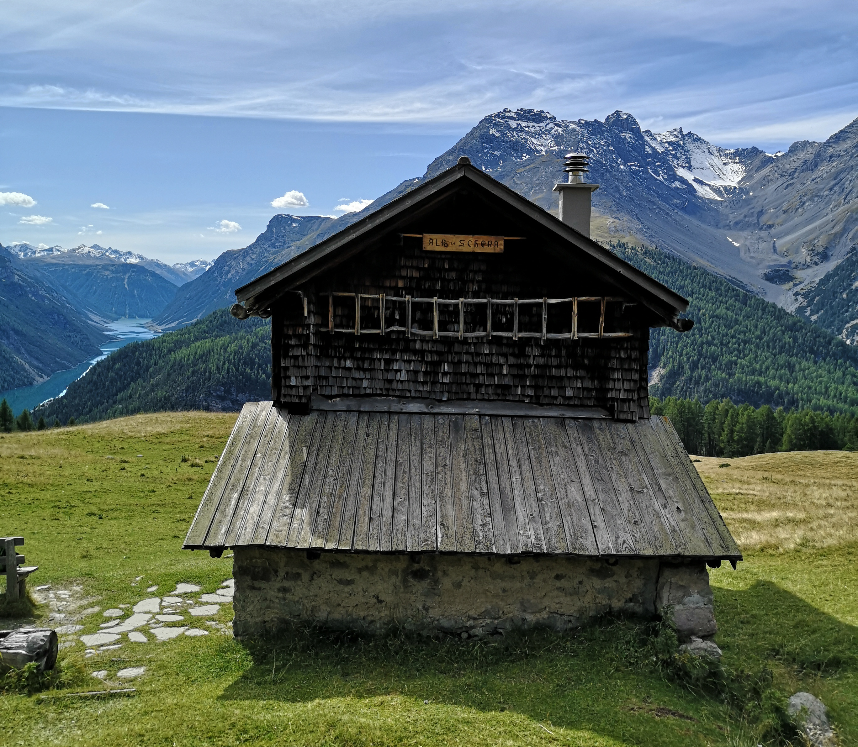 Immer weiter aufwärts geht’s auf einem wunderschönen Weg weiter durch die Wälder und es eröffnet sich hin und wieder ein weiter Blick in die Berglandschaft. Am Ende des Waldes blickst du bereits auf den Lago di Livignio, ein Speichersee mit einer 130 m hohen Staumauer, bis du den Rastplatz der Alp la Schera erreichst. An der Alphütte solltest du unbedingt eine Pause einlegen, um die vielen Murmeltiere beim Fressen zu beobachten und natürlich die Aussicht zu geniessen.